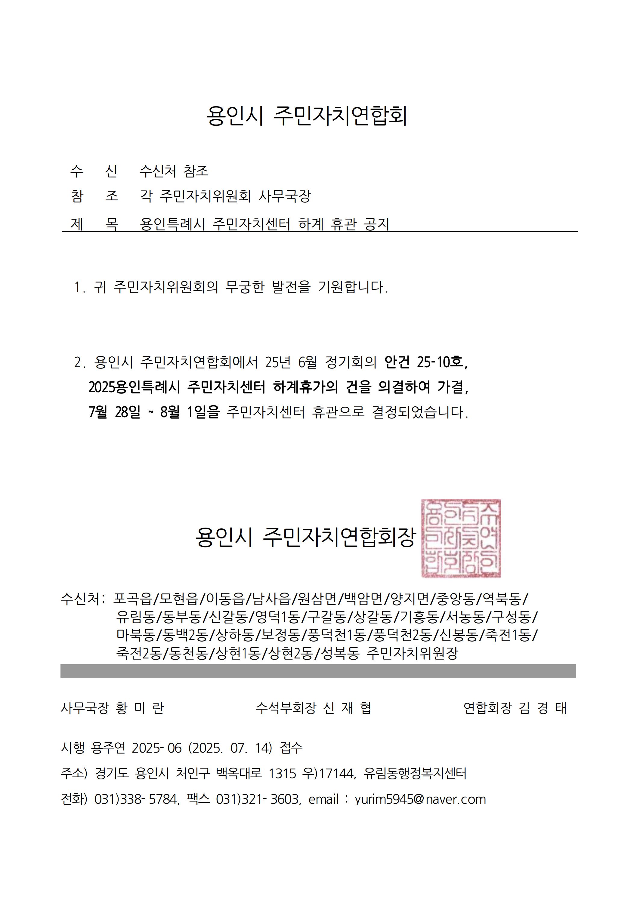 2025년 7월 28일 (월) ~ 8월 1일 (금)까지 용인시 주민자치센터 하계 휴관 기간 입니다