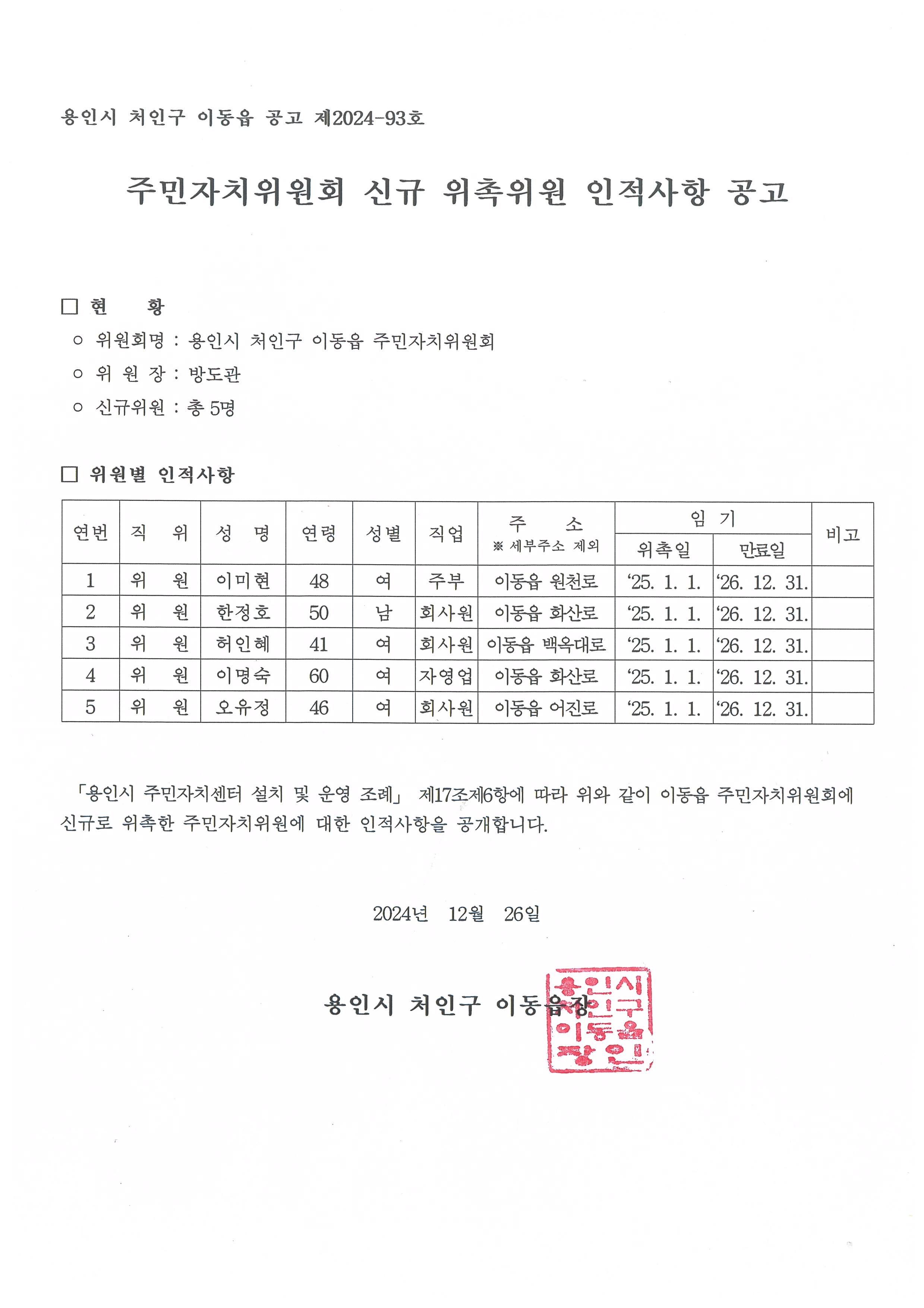 이동읍 주민자치위원회 위원 인적사항 공고