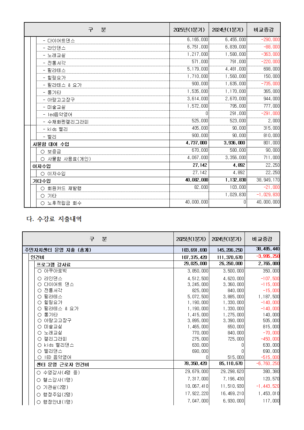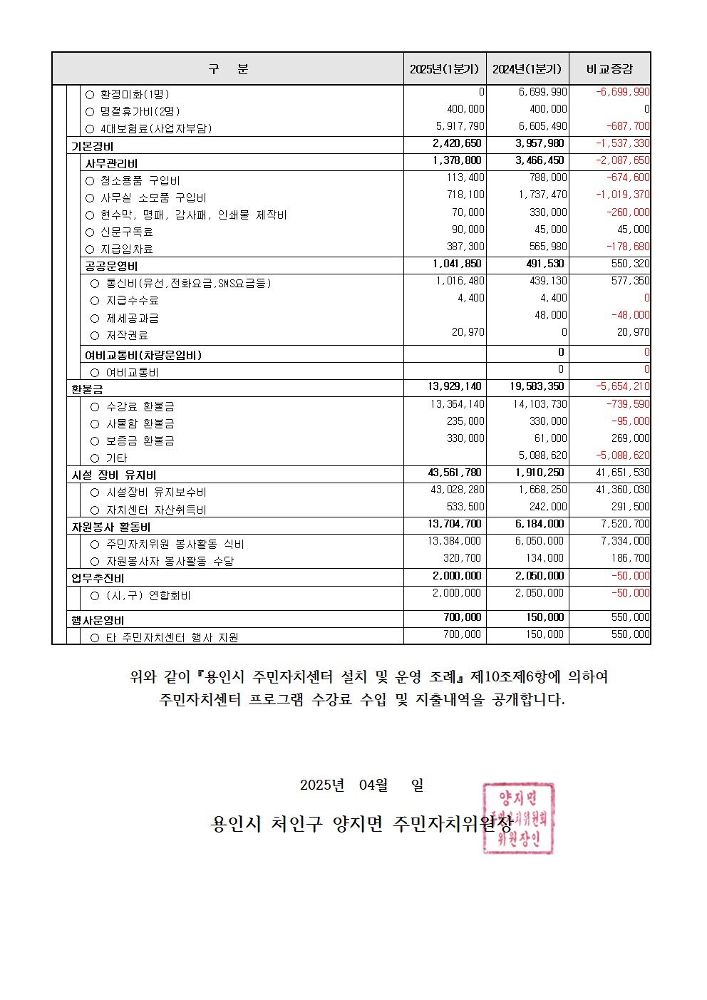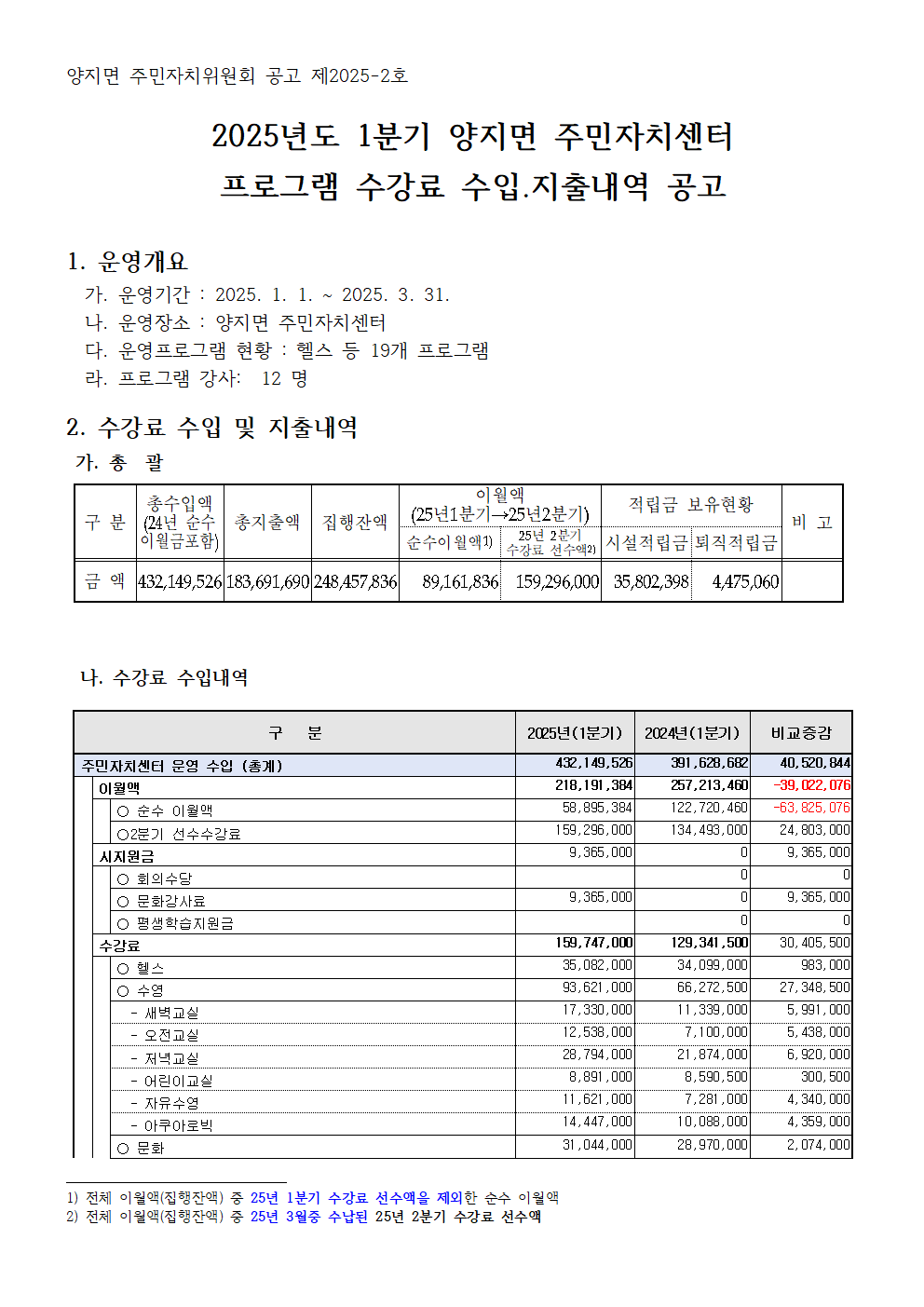 2025년 1분기 양지면주민자치센터 수강료 수입.지출 공고