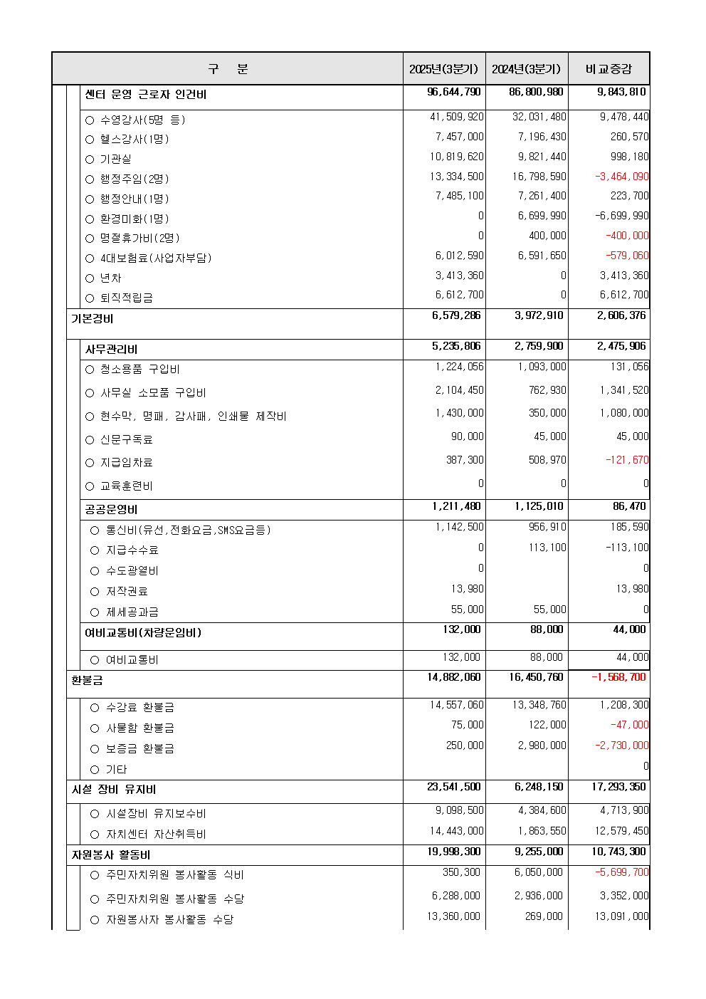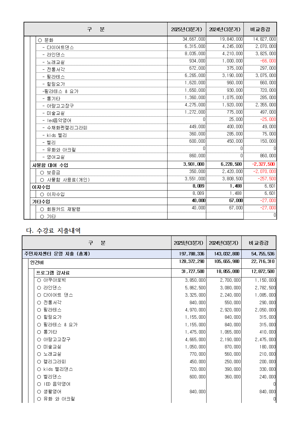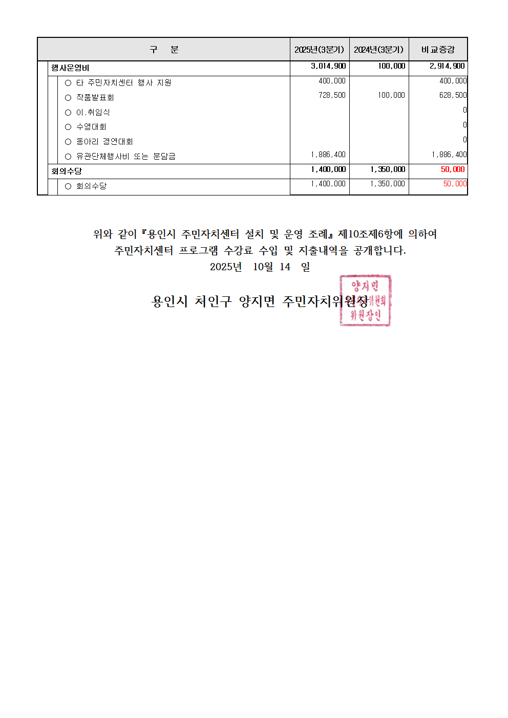 2025년 3분기 양지면주민자치센터 수강료 수입.지출 공고