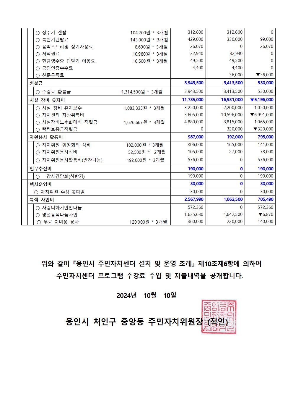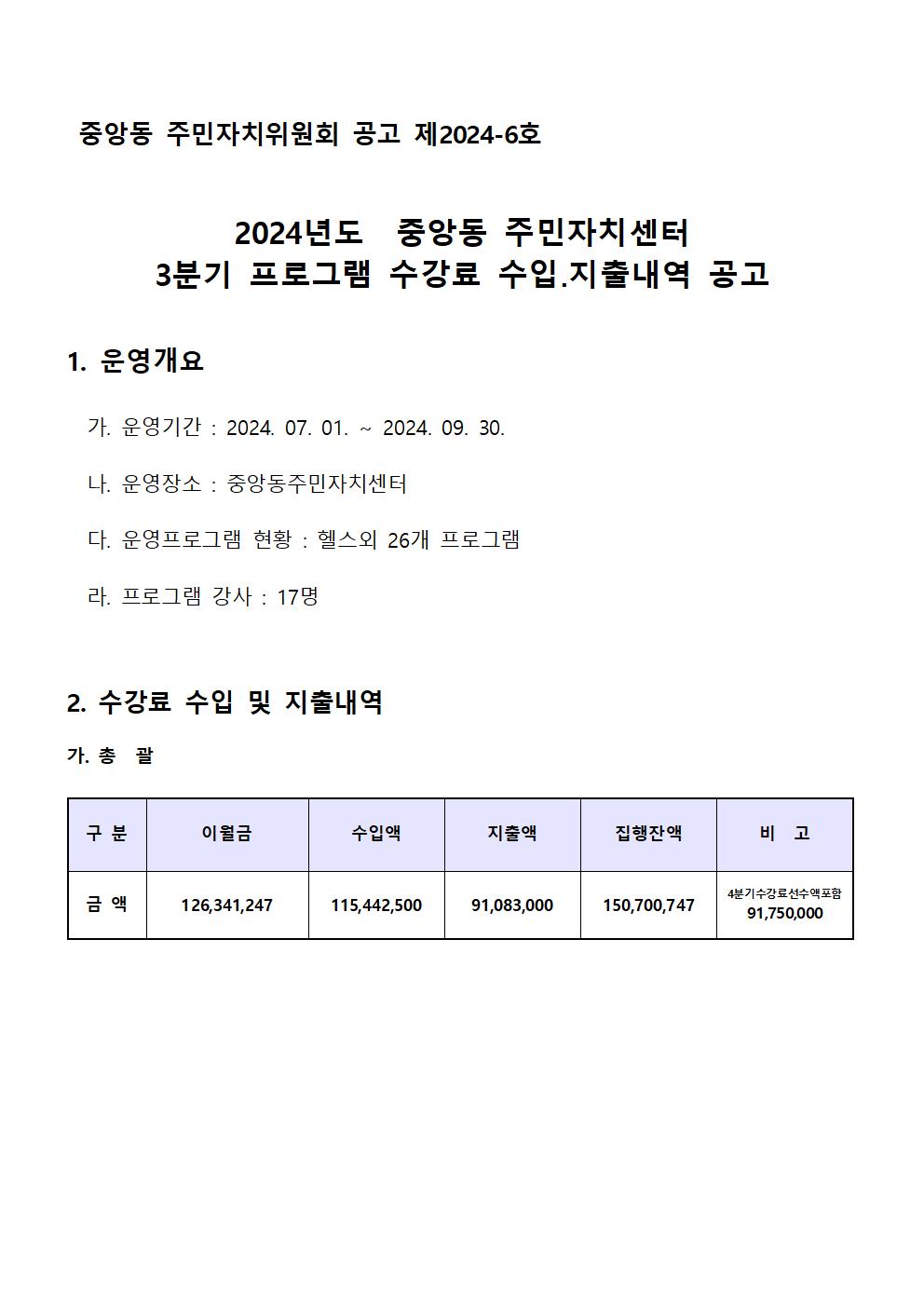 중앙동 주민자치센터 3분기 프로그램 수입.지출내역을 아래와 같이 공고 합니다.