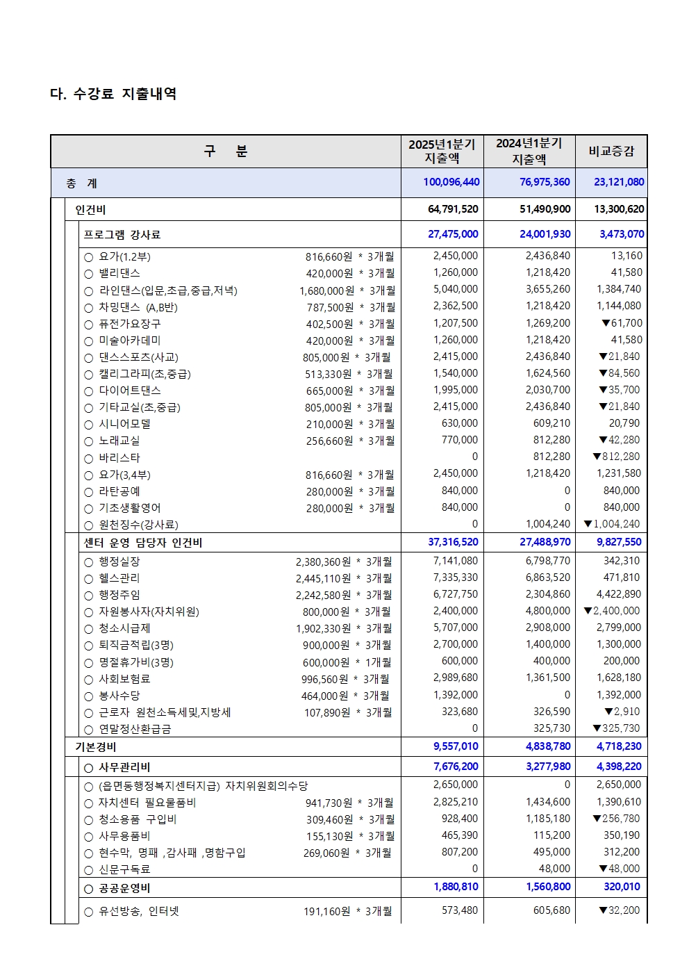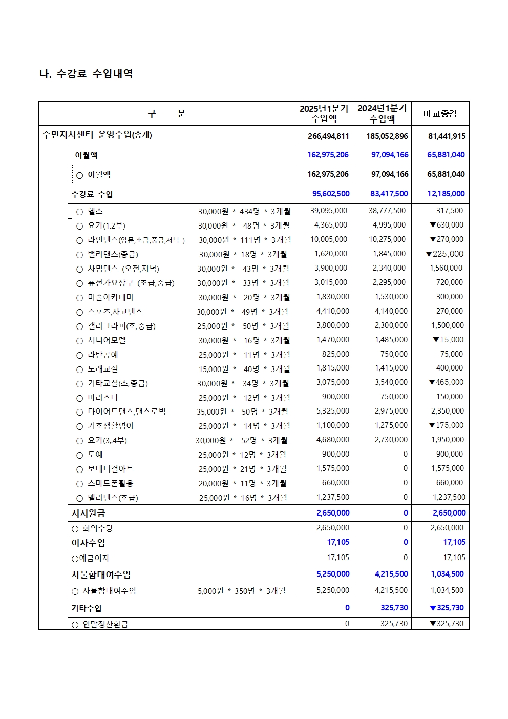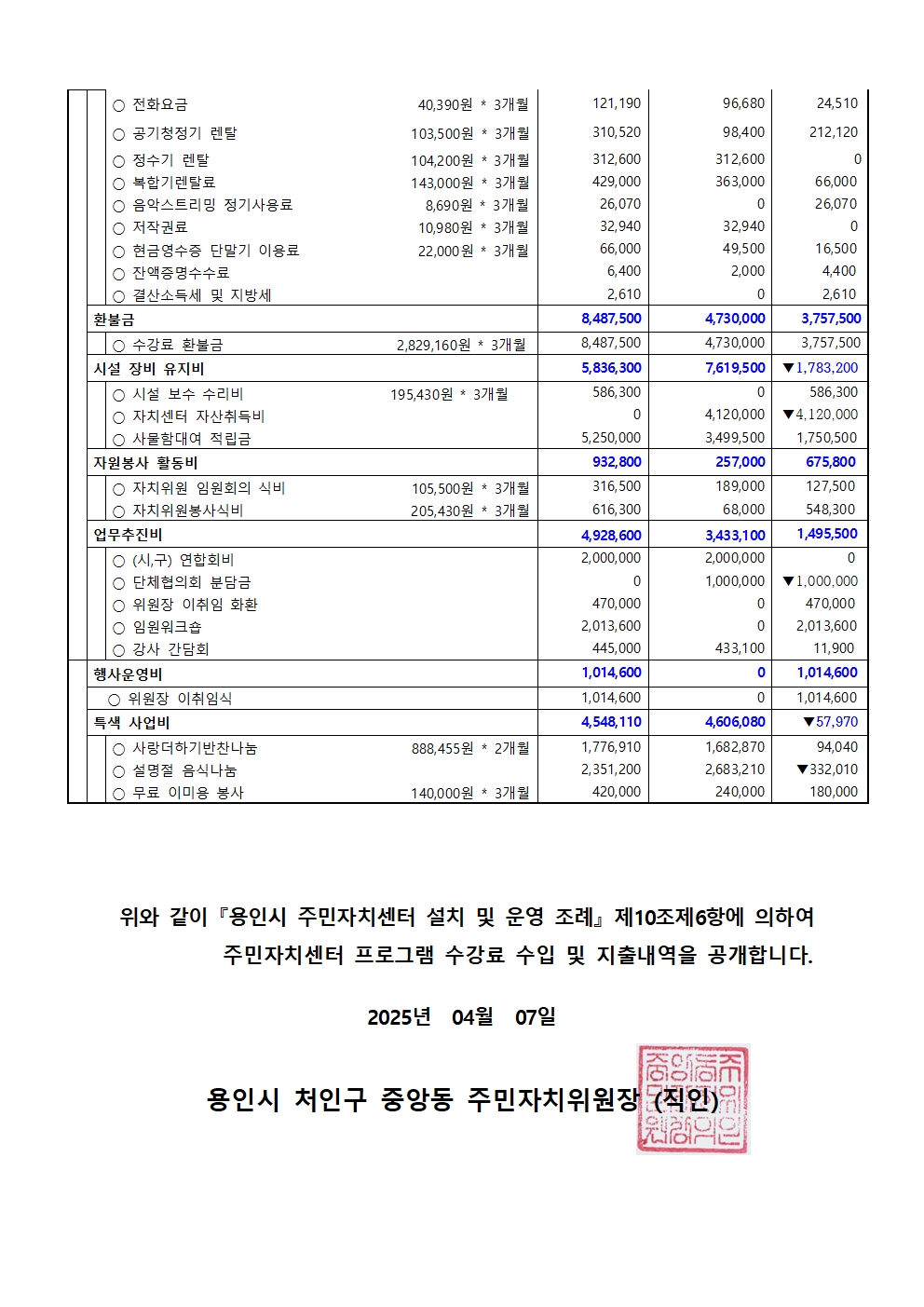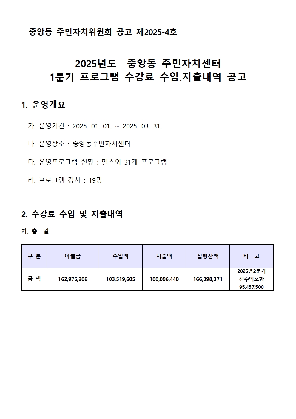 2025년 중앙동주민자치센터 1분기 프로그램 수강료 수입.지출 내역 공고