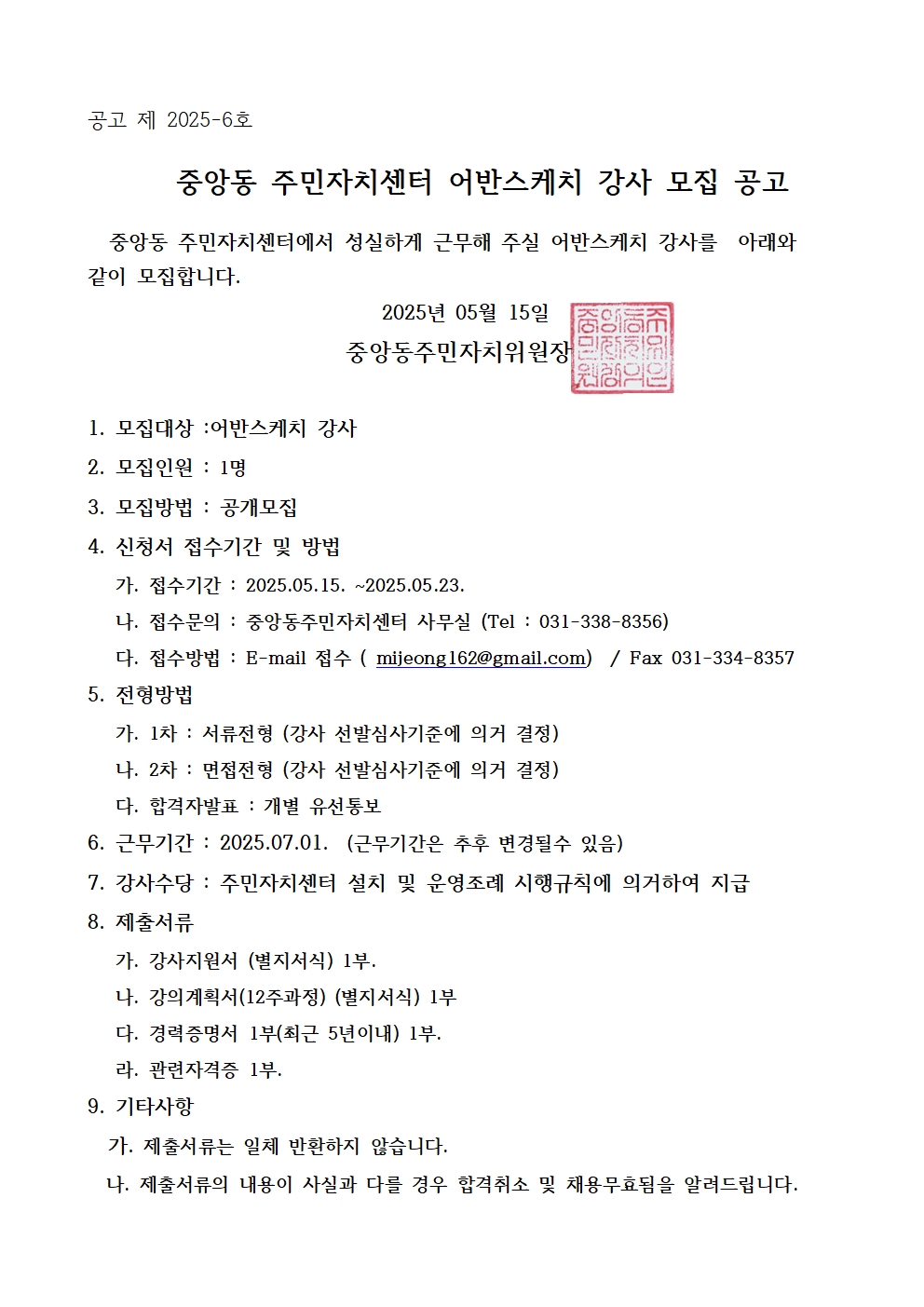 중앙동 주민자치센터에서 함께 일해주실 강사님을 아래와 같이 모집 합니다.