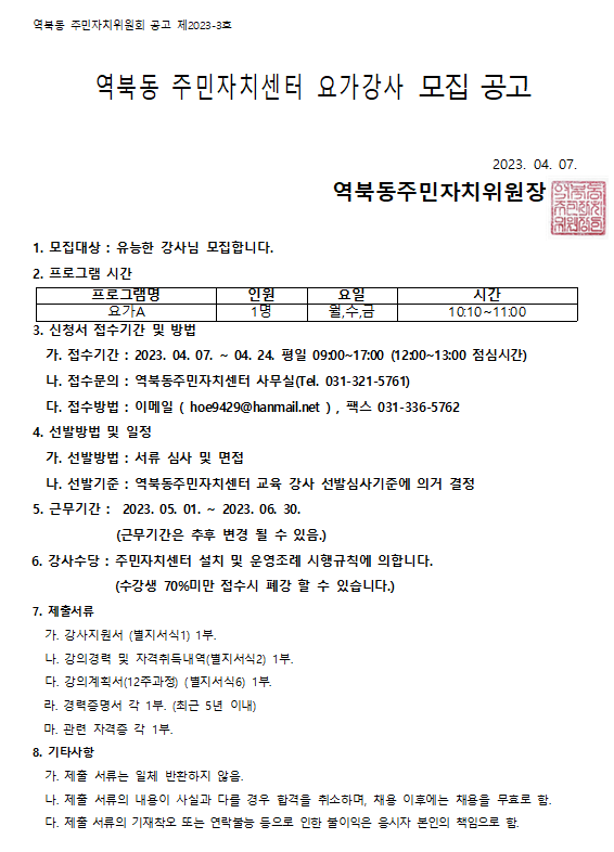 역북동주민자치센터 요가강사 모집