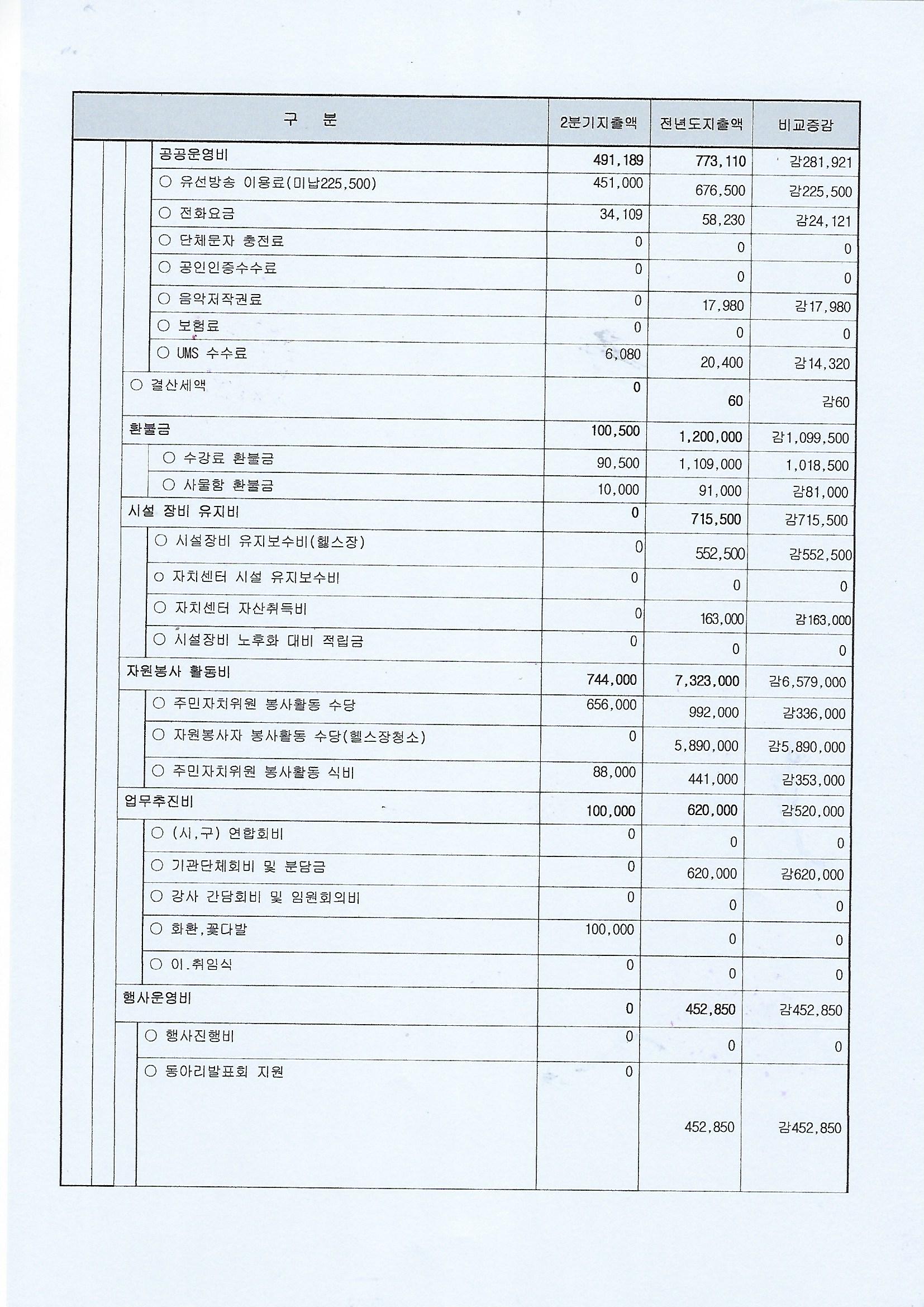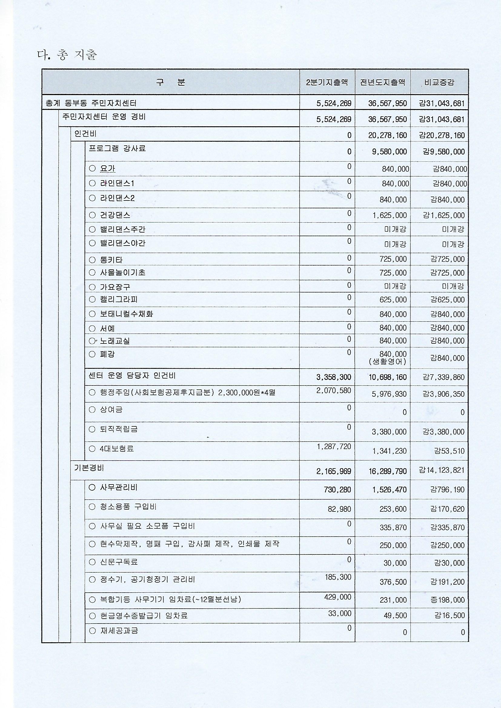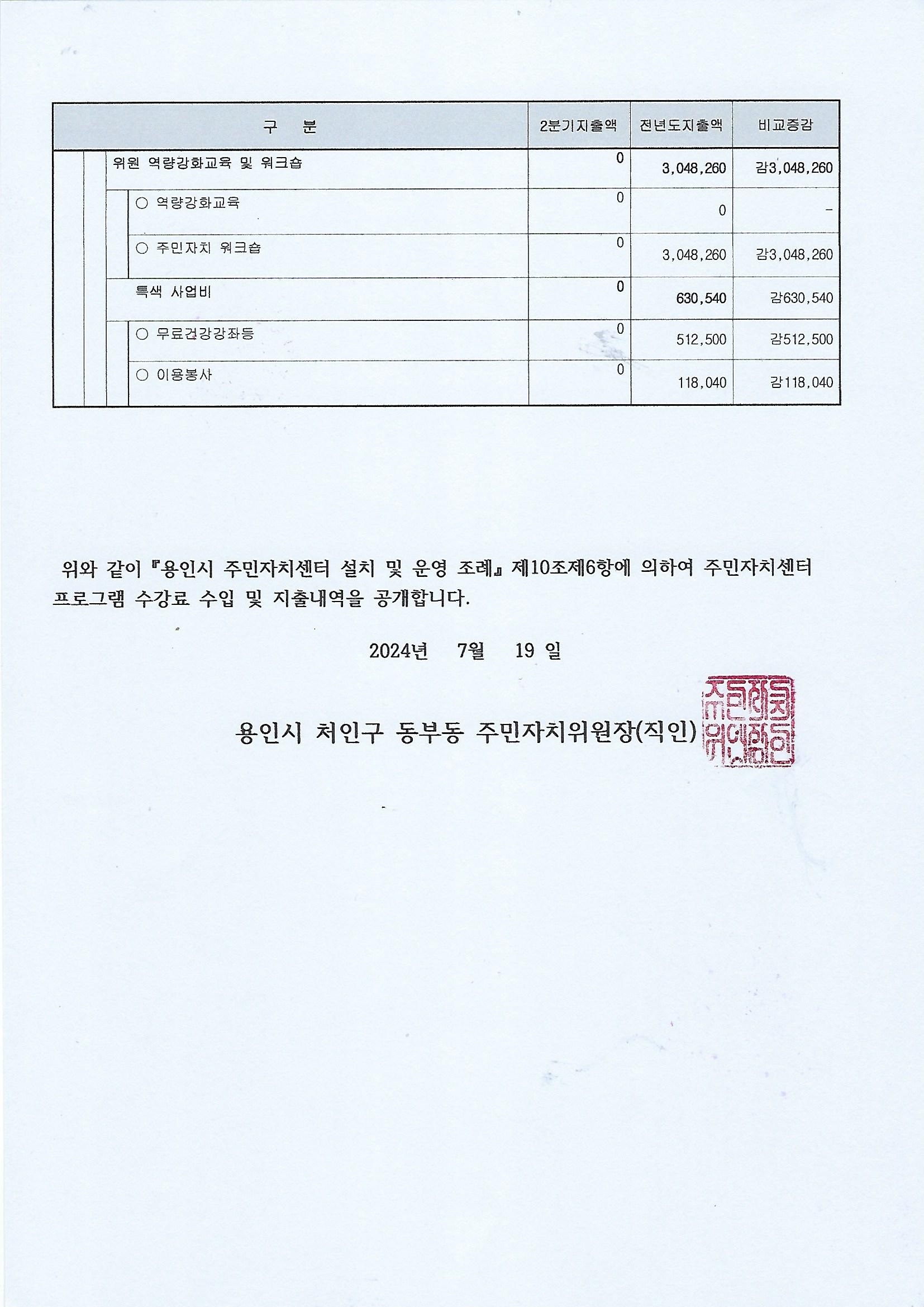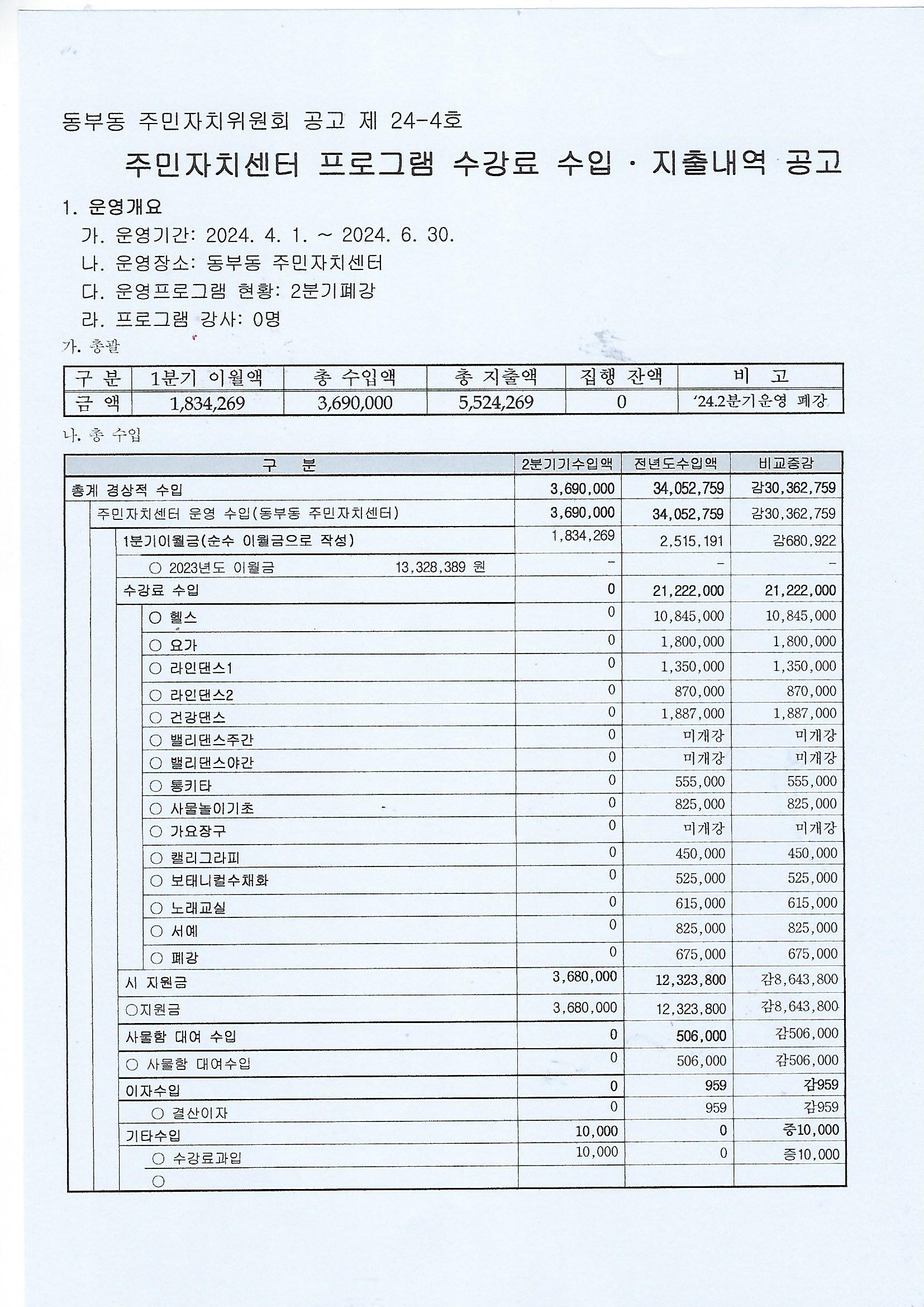 2024년 2분기 동부동주민자치센터 수강료 수입.지출 내역 공고