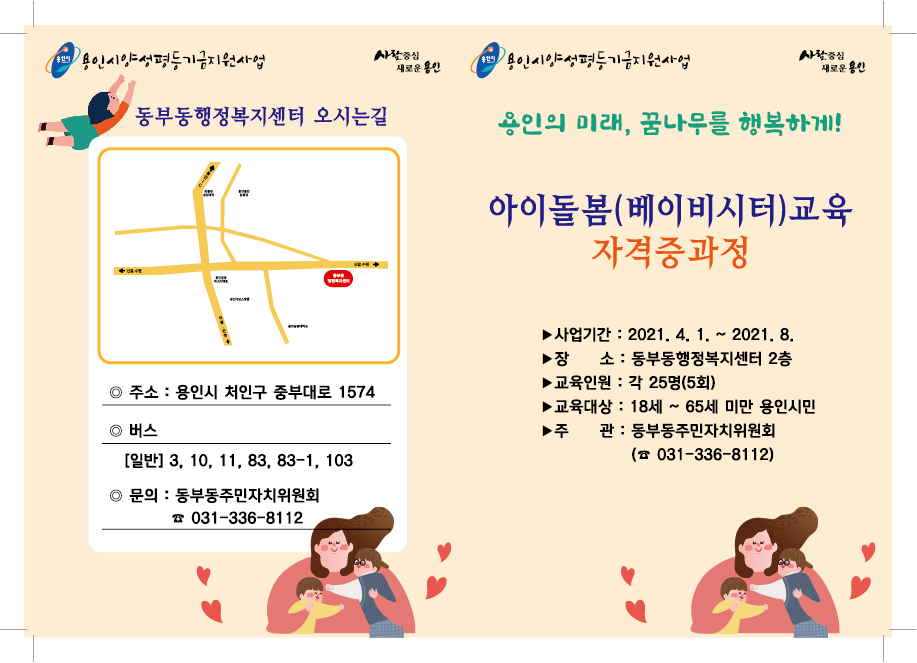 4월~8월까지 우리동부동주민자치센터에서 용인시민대상으로 '베이비시터자격증반'교육과정을 접수합니다.